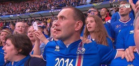 Ce monsieur que vous voyez sur cette photo est le Président de la république d’Islande! Il a refusé la tribune officielle pour s’asseoir dans les gradins avec ses concitoyens. Quel patriote!