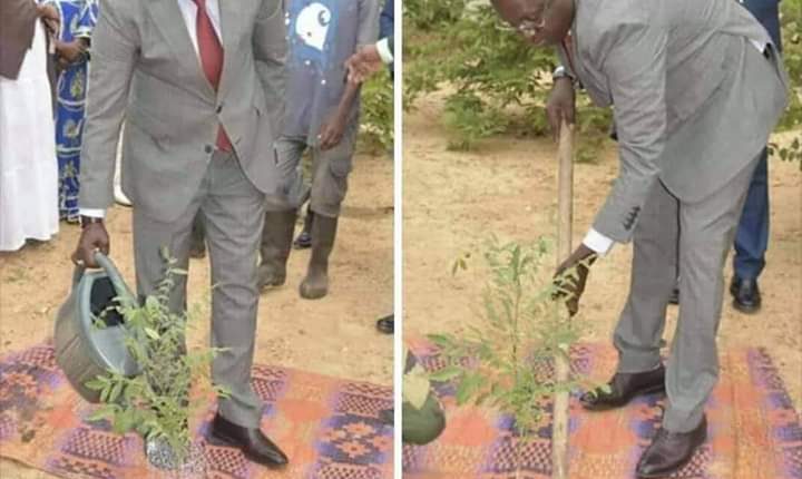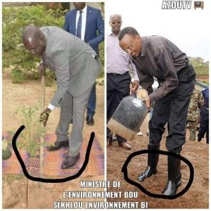 Choquantes ces images du ministre de l’environnement qui plante un arbre symbolique , debout sur un natte de prière , engoncé dans un costard rappelant le fameux « renégat » du poème de David Diop, Monsieur ne semble sentir la canicule ambiante. Qui disait que costume+canicule = aliénation ? Imaginez l’effet de ces images sur les occidentaux ! L’on se rappelle la boutade raciste de Trump houspillant les Nègres incapables de marcher dans des souliers !