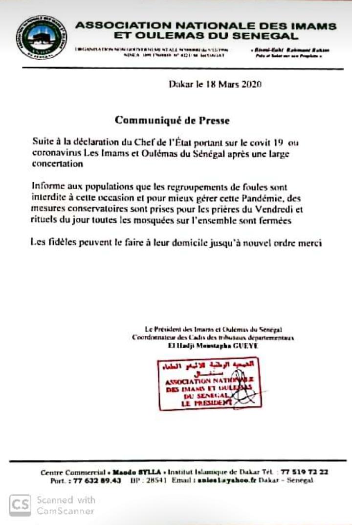 L’association des imams et oulémas du Sénégal a pris la décision de suspendre la prière de vendre jusqu’à nouvelle ordre, ce, pour être en phase avec l’Etat dans les mesures préventives contre le Coronavirus.
