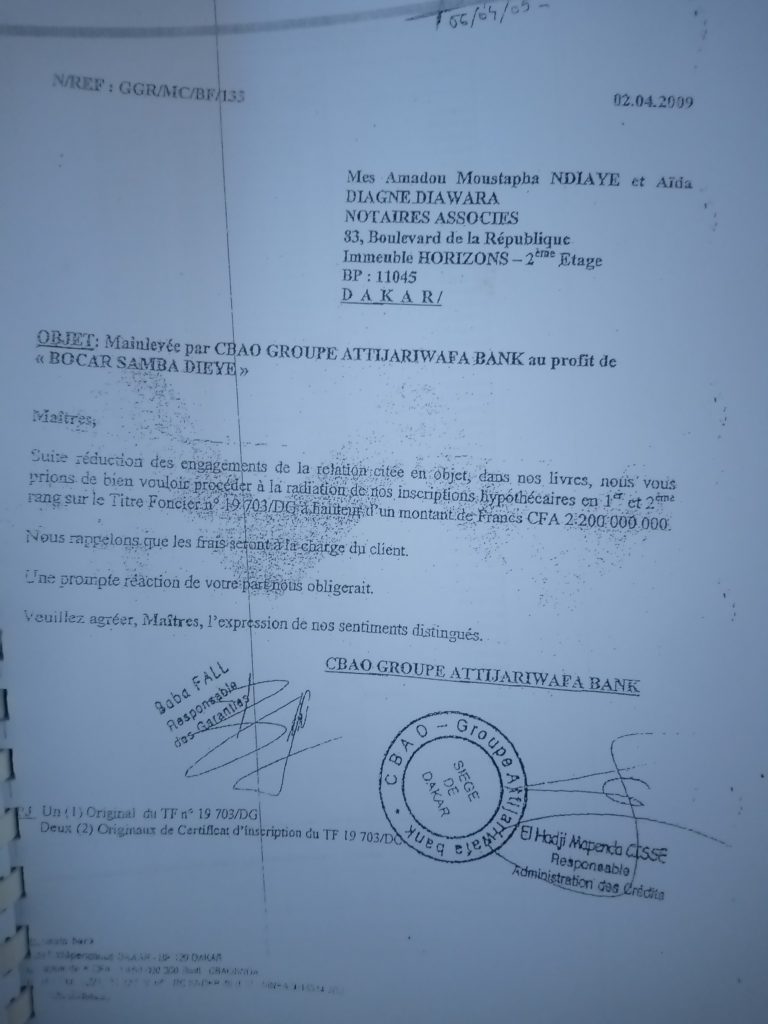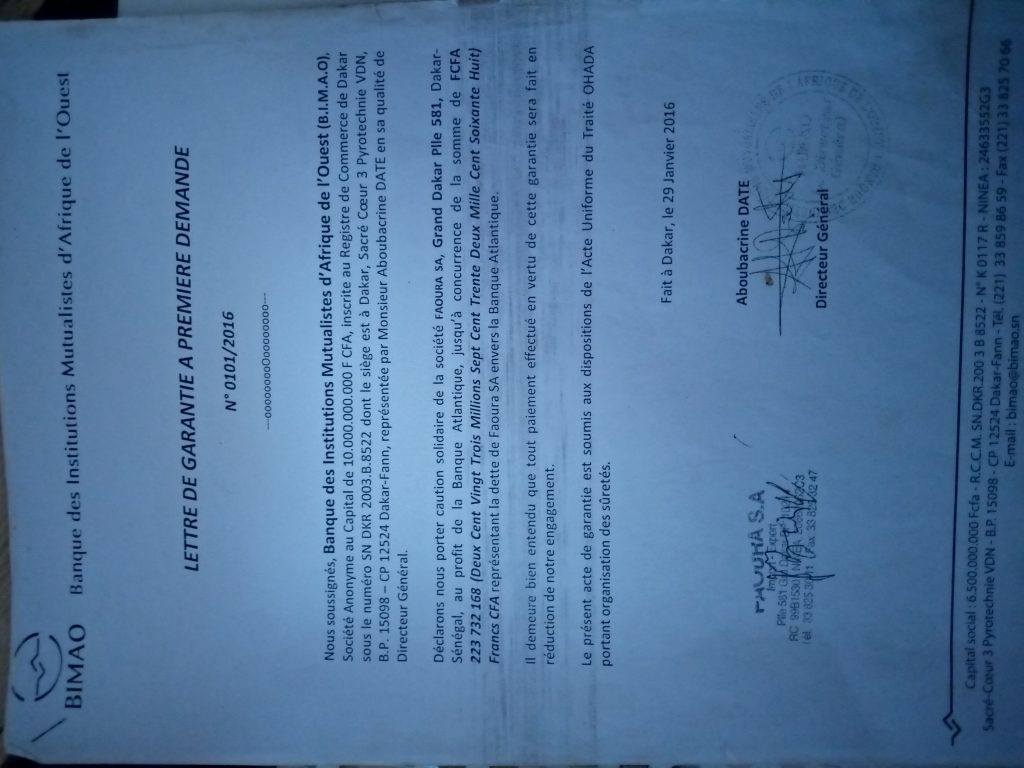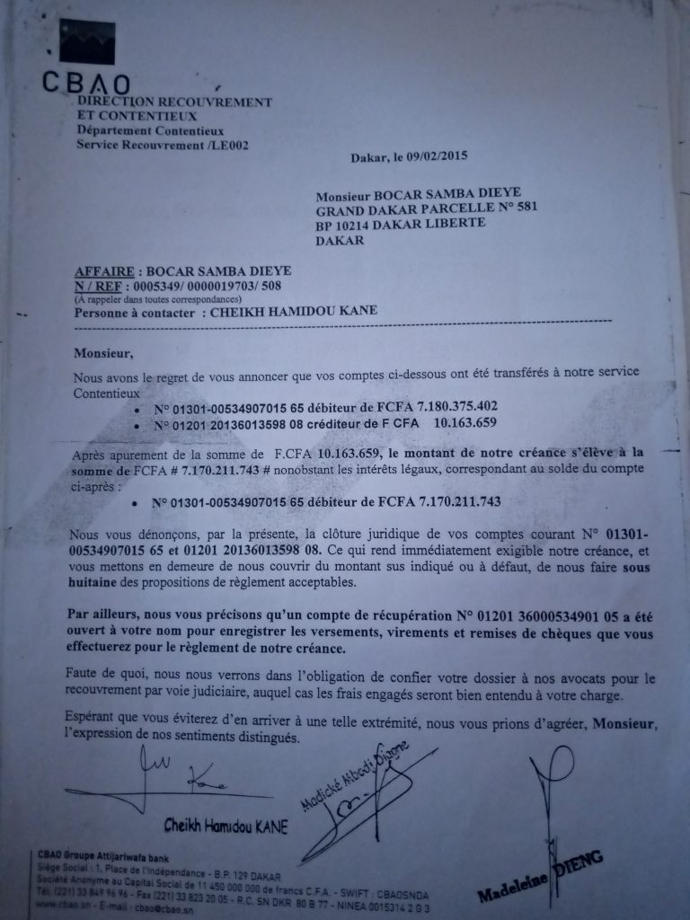 S’agissant de la banque Atlantique, je lui devais 105 millions francs cfa. Les experts ont estimé que ma dette vis a vis de cet établissement se montant plutôt a 223 millions. J’ai accepté et j’ai mis cette somme a la disposition de la banque Atlantique depuis (3) ans comme atteste la fac similé. Seulement voila, elle refuse de prendre cet argent et veut elle aussi recupérer mes biens immobiliers. Telle est, en résumé la situation qui m’oppose a la banque atlantique. Je Tiens a la disposition de quiconque voudrait obtenir des informations á propos de ce contentieux, tous les documents étayant mes dires. La banque insiste a vouloir réclamé le réglement du solde débiteur de 518.749.143 de francs cfa, sur ce montant Bocar conteste des a Jour et frais á hauteur de 297.114.952 Le solde accepté par lui par tous compte de 221.634.120.C’est la raison pour laquelle il a constitué une provision a la BIMAO d’une de 230.000.000 pour le réglement définitive de cette dossier