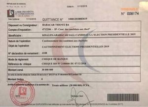 Voici la quittance du dépôt de Khalifa Sall auprès du conseil constitutionnel ( photo). Cette quittance semble prouver que l’ancien Maire de Dakar a une chance de sortir du prison afin de réaliser son ultime reve, celui de détonner le Président Sall de son fauteuil présidentiel. En tout cas l’avenir nous édifiera sur la suite des événements